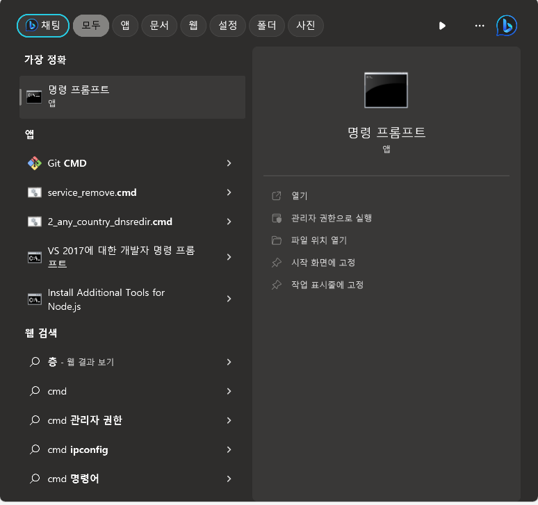 1. 명령 프롬프트를 관리자 권한으로 실행 하고 다시 명령어를 입력해봅니다.